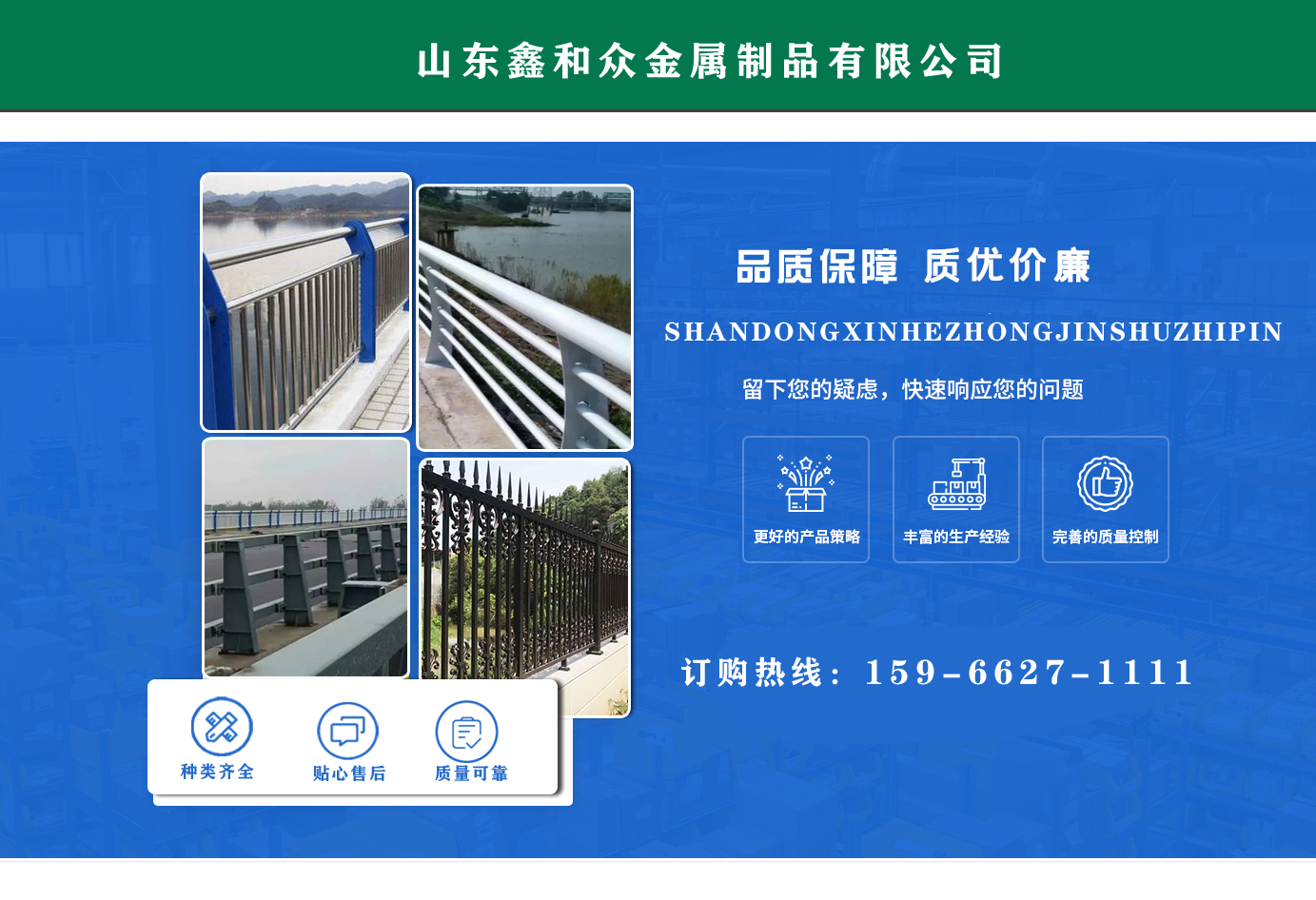 山東鑫和眾金屬制品有限公司主要產(chǎn)品有防撞護(hù)欄,橋梁護(hù)欄,道路護(hù)欄,河道護(hù)欄,不銹鋼護(hù)欄等護(hù)欄。提供設(shè)計(jì)方案,一站式定制,包您滿意價(jià)格優(yōu)惠,歡迎來(lái)電咨詢! 公司常年從事銷售護(hù)欄防撞護(hù)欄,橋梁護(hù)欄,道路護(hù)欄,河道護(hù)欄,不銹鋼護(hù)欄,橋梁鋼護(hù)欄,河道燈光護(hù)欄等。產(chǎn)品廣泛應(yīng)用于橋梁、河道、旅游景區(qū)、道路、公路、公園、小區(qū)、景觀、道路防撞等領(lǐng)域?! 」井a(chǎn)品均采用優(yōu)質(zhì)不銹鋼材料,符合相關(guān)標(biāo)準(zhǔn)。各種型號(hào)不銹鋼復(fù)合管及護(hù)欄,質(zhì)量嚴(yán)格把控。產(chǎn)品強(qiáng)度高、耐腐蝕、焊接牢固、抗沖擊、性能好,防撞護(hù)欄結(jié)構(gòu)簡(jiǎn)單、美觀實(shí)用大方?! g迎前來(lái)訂購(gòu)!...